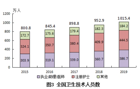 2019年末衛(wèi)生人員總數(shù)中,衛(wèi)生技術(shù)人員1015.4萬人,鄉(xiāng)村醫(yī)生和衛(wèi)生員84.2萬人,其他技術(shù)人員50.4萬人,管理人員54.4萬人,工勤技能人員88.4萬人。衛(wèi)生技術(shù)人員中,執(zhí)業(yè)(助理)醫(yī)師386.7萬人,注冊護(hù)士444.5萬人。與上年比較,衛(wèi)生技術(shù)人員增加62.5萬人(增長6.6%)(見表2)。