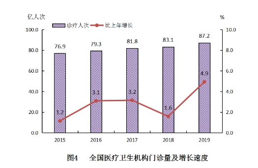 ?。ㄒ唬╅T診和住院量。2019年,全國醫(yī)療衛(wèi)生機(jī)構(gòu)總診療人次達(dá)87.2億人次,比上年增加4.1億人次(增長4.9%)。2019年居民到醫(yī)療衛(wèi)生機(jī)構(gòu)平均就診6.2次。