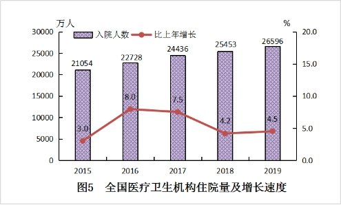 2019年,全國醫(yī)療衛(wèi)生機(jī)構(gòu)入院人數(shù)26596萬人,比上年增加1143萬人(增長4.5%),年住院率為19.0%。